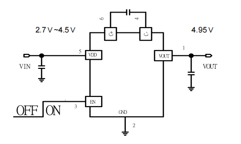 TX4314 从 2.7V 至 4.5V 输入产生稳定的输出电压。